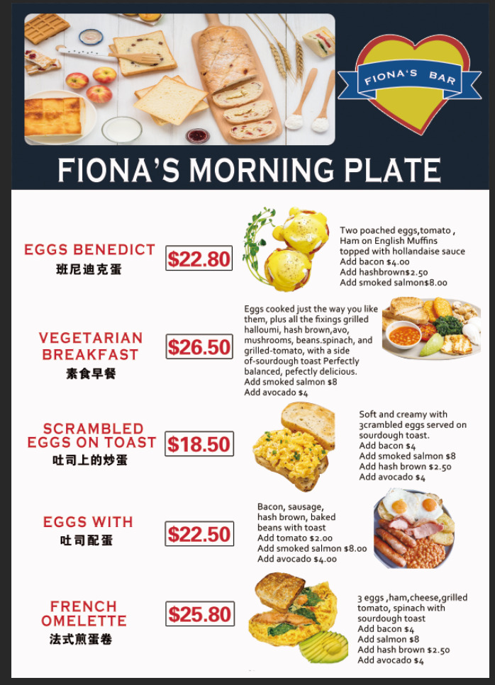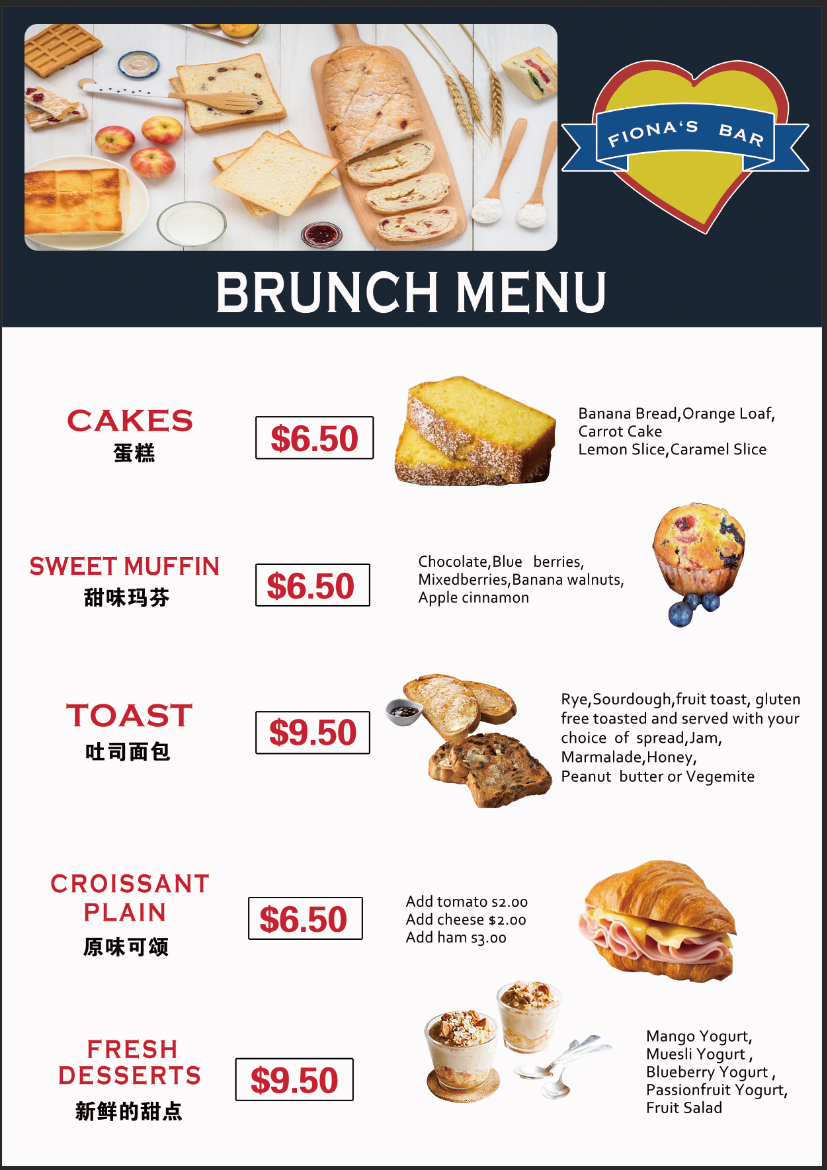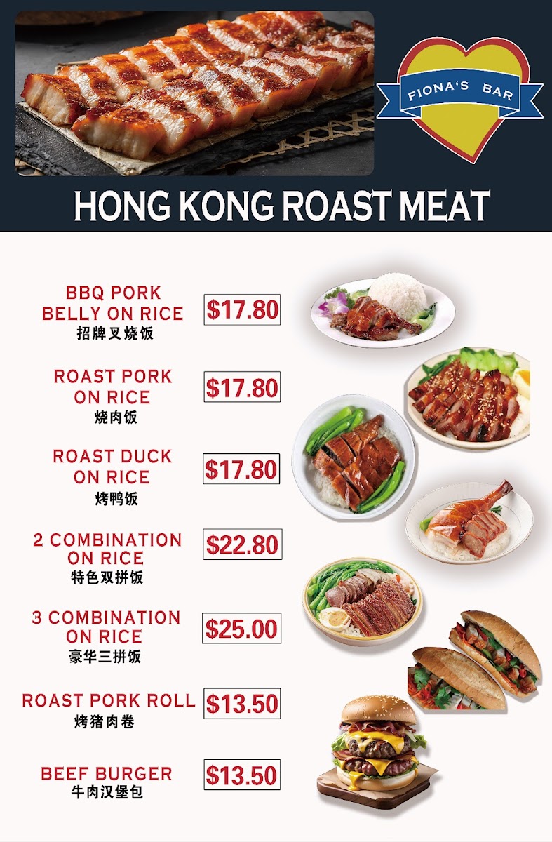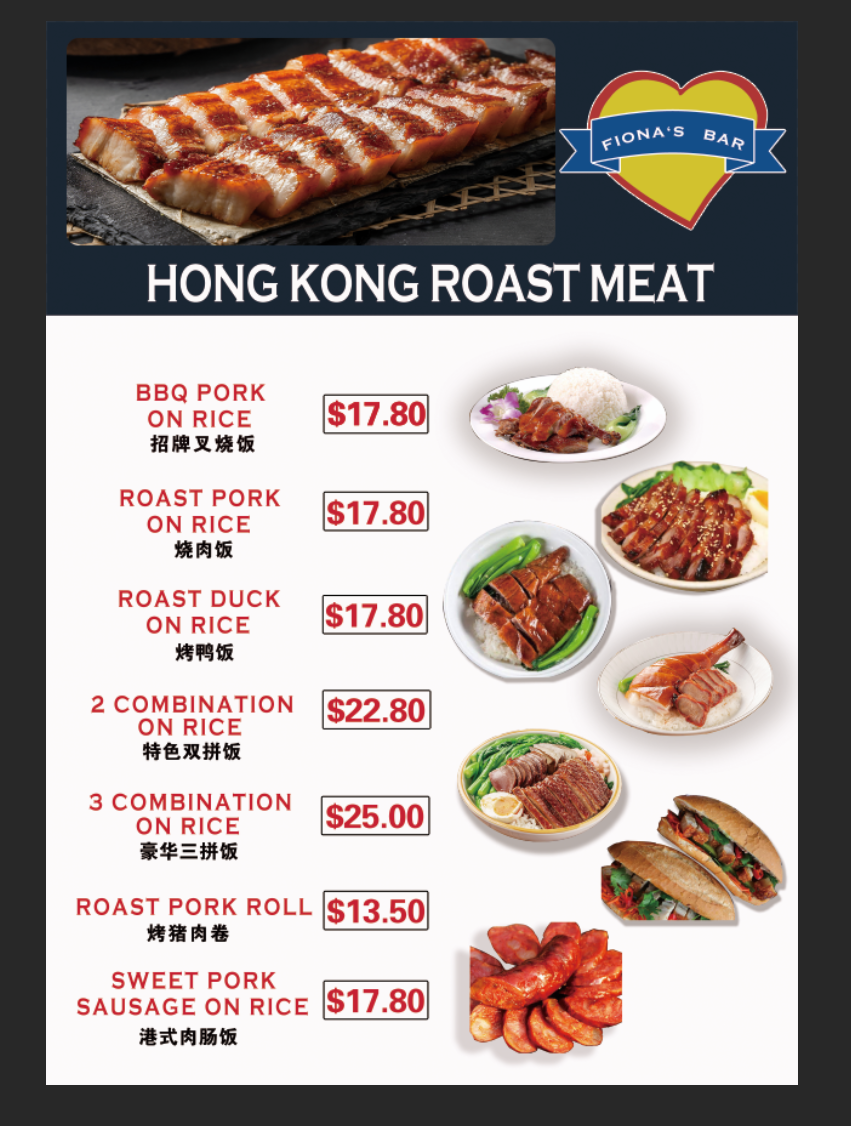 Food items are organized broadly into brunch plates and Hong Kong-style roast meat dishes served with rice and vegetables. Brunch options include toast and breakfast plates designed for morning or midday dining.