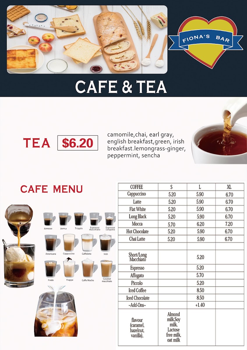 The drinks menu emphasizes café staples such as coffee and tea, accompanied by a selection of wines suited for casual wine bar service.